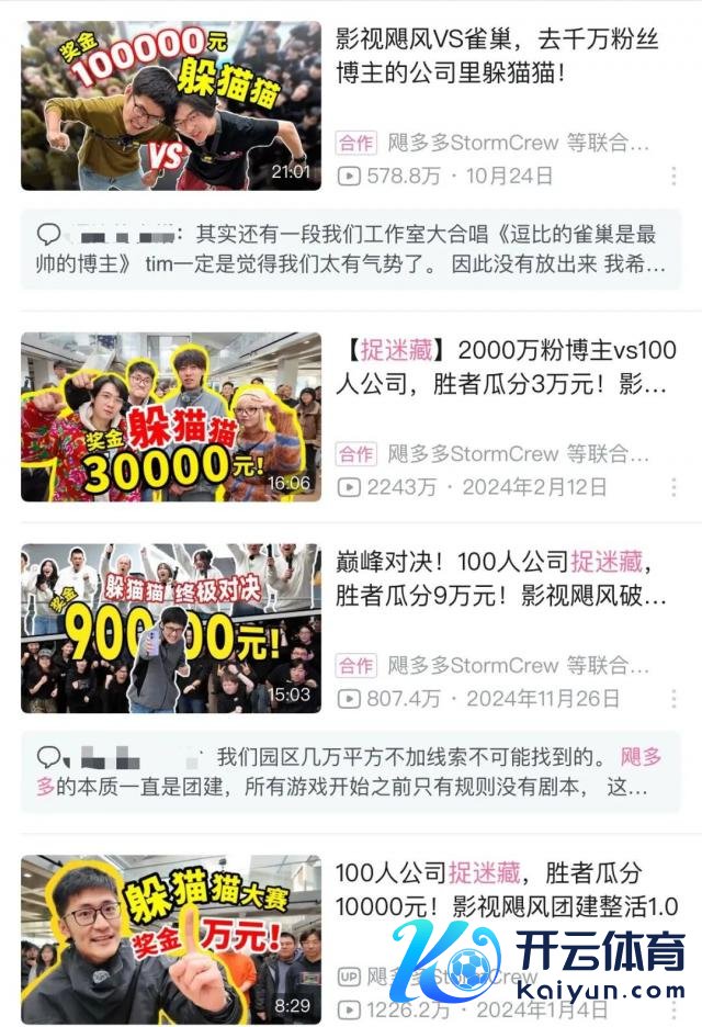 2024 年,影视飓风的子账号"飓多多 StormCrew "推出了第一个综艺向的骨子,《100 东谈主公司捉迷藏,胜者平分 10000 元!影视飓风团建整活 1.0》,记载了影视飓风公司里面第一届躲猫猫大赛,由 Tim 厚爱找到躲起来的职工,活命下来的东谈主,平分 1 万元的奖金。