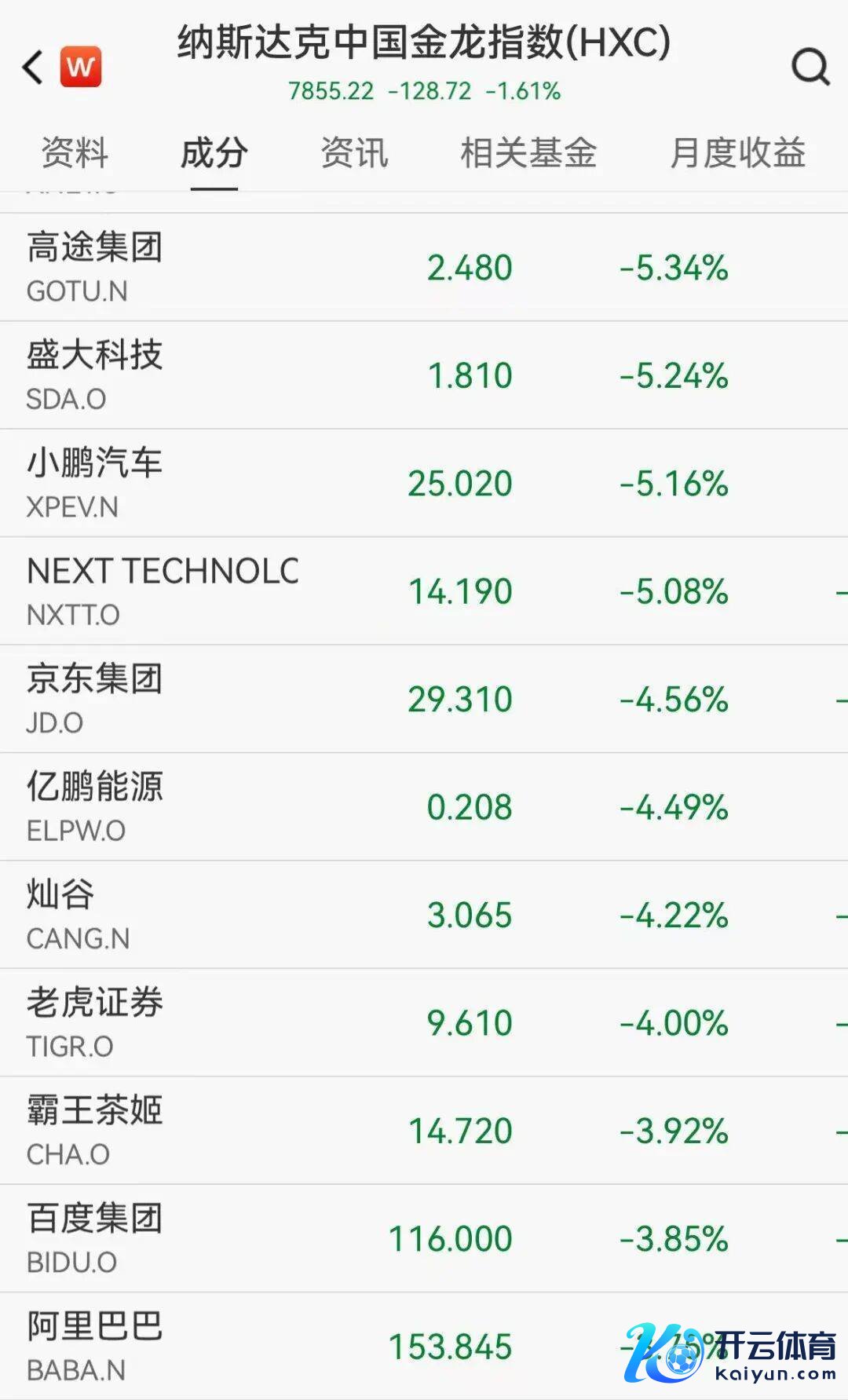 中概股遍及下落,纳斯达克中国金龙指数跌1.61%,万得中概科技龙头指数跌2.28%。个股方面,富途控股跌超7%,高途集团跌逾5%,小鹏汽车跌超5%,京东集团跌逾4%,百度集团、阿里巴巴跌近4%,老虎证券跌约4%,阿特斯太阳能涨超17%,雾芯科技涨逾10%,大全新动力涨近6%,晶科动力涨超2%,涂鸦智能涨近2%。