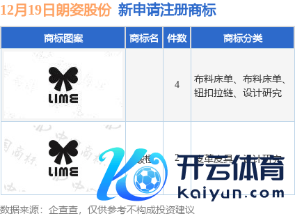本站音讯云开体育,凭据企查查数据闪现,近日朗姿股份有限公司新提交“酸橙”等6件商标注册肯求。商标肯求笃定如下: