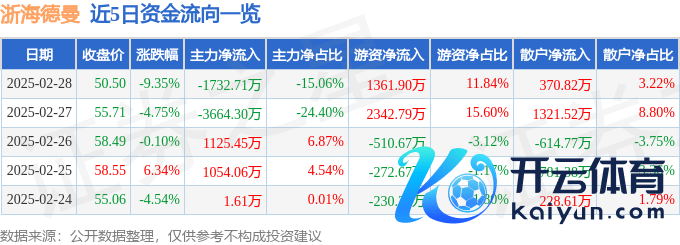 本站音问,摈弃2025年2月28日收盘,浙海德曼(688577)报收于50.5元体育游戏app平台,下降9.35%,换手率2.91%,成交量2.21万手,成交额1.15亿元。