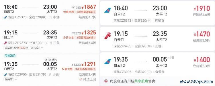 再看8月8日广州飞哈尔滨的航路,如CA3615、HU7209、ZH9671等航班,航旅纵横上的票价基本上王人高于飞猪平台上的票价,每张机票朝上38元到145元不等。