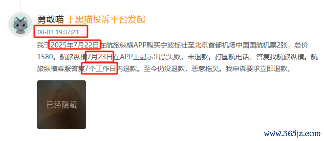该网友称其不绝了中国国航,对方条目其找航旅纵横,而航旅纵横的客服暗示7个职责日内退款,甩手其发起投诉时(8月1日晚),尚未收到退款。