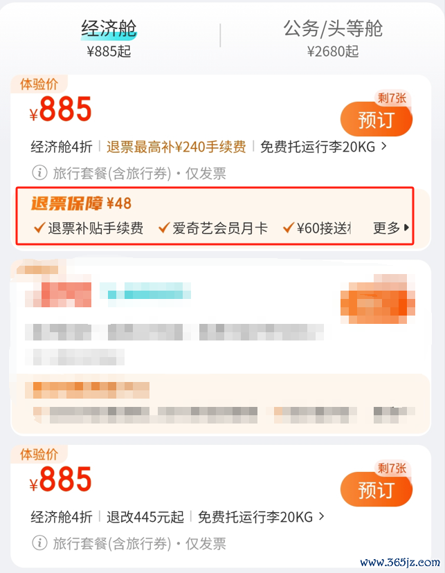 以某OTA平台为例,采选8月8日的MF8470航班(成王人—北京),其在搜索页面炫夸的价钱为885元,在点击干涉后,有同航班的多个居品可供罗致。其中,排在第一、第三位的机票裸价均为885元,但第一位居品寥落系缚了一个48元的退票保障套餐。