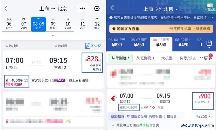 以8月8日MU5099航班(上海—北京)为例,航旅纵横上的票价为900元/张;而在东航的官方小步伐上,该航班的机票最低为828元/张,属于身份认证居品。