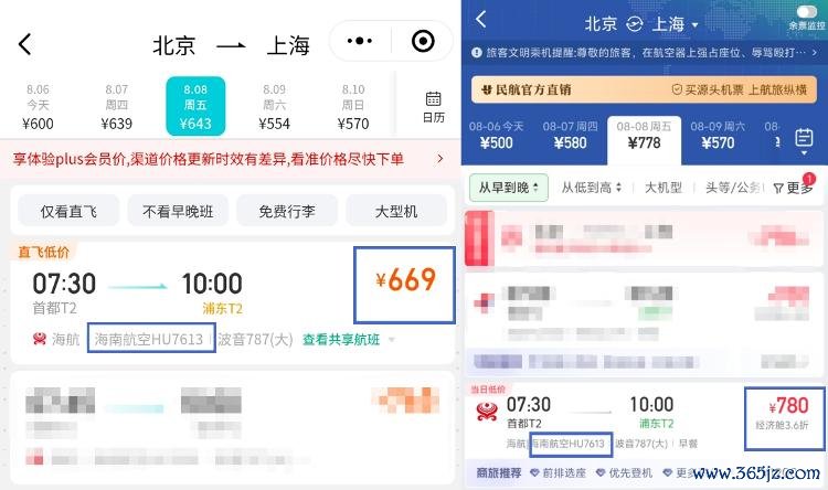 以8月8日北京飞上海的航班HU7613为例,在航旅纵横上的机票价钱为780元/张,而去哪儿的价钱为669元/张。两比较较,航旅纵横的票价比去哪儿贵16.59%。