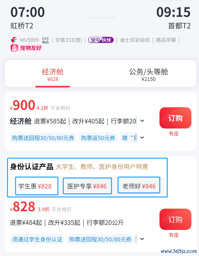 该类居品是大学生、老师、医护身份用户不错享受的特惠居品。其中,大学生不错以828元/张的价钱购买该机票,老师和医护不错以846元/张的价钱购买该机票,均低于航旅纵横。