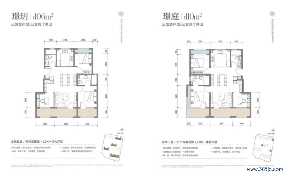 √ 约106㎡~110㎡三居,三面宽朝南,主卧配备270°转角飘窗,引景入室,采光透风俱佳;