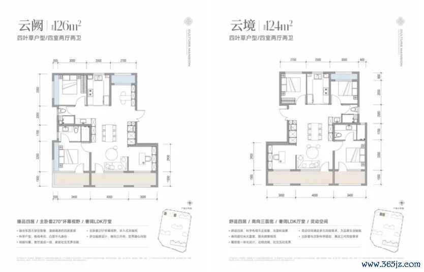 √ 约124㎡~126㎡四居,遴选四叶草布局,保证多代东说念主互不侵扰,主卧套房式运筹帷幄+自带衣柜请托,彰显改善本质。