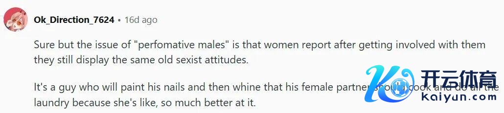 “……‘饰演男’的问题在于,好多女性暗意,交游之后,他们依旧会展现出老掉牙的性别愤激格调。一个男的可能我方涂着指甲油,却怀恨女一又友应该负责作念饭洗衣,因为‘她愈加擅长这些’。“